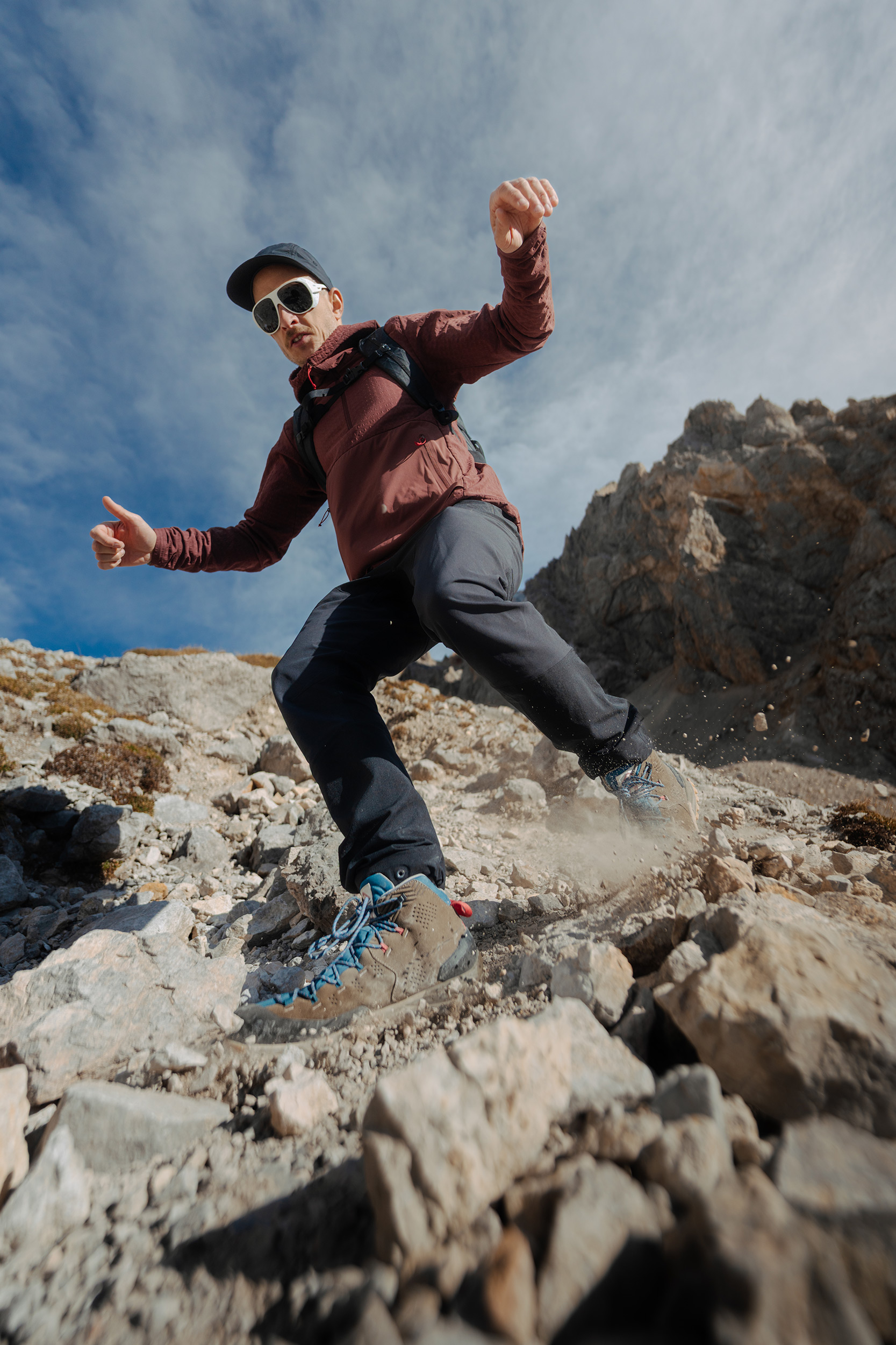 Derfor viser Gabors billeder ofte produkter på en tilfældig måde. "Med en optagelse som denne handler det ikke kun om skoene, men om de oplevelser, de kan give dig...i de høje bjerge, hvor du kan nyde en kop kaffe med en fantastisk udsigt, gå på spændende stier eller opleve nye udsigter sammen med gamle venner. Fodtøjet gør disse oplevelser tilgængelige, men på 10 billeder vil kun tre være nærbilleder. Resten er billeder, der udtrykker glæde og tilfredshed." Selvfølgelig er Gabors "kontor" et sted, hvor det kræver seriøse færdigheder og kræfter at arbejde, og det er tydeligt i hans grundige tilgang til planlægningen af optagelserne. "Forberedelserne er omfattende," forklarer han. "Vi leder efter steder, forudsiger vejret og lyset, og planlægger ruter op ad bjerget i overensstemmelse hermed. Derudover bærer vi alt udstyret og produktet og matcher det til garderoben. Så 20 par sko betyder 20 outfits."