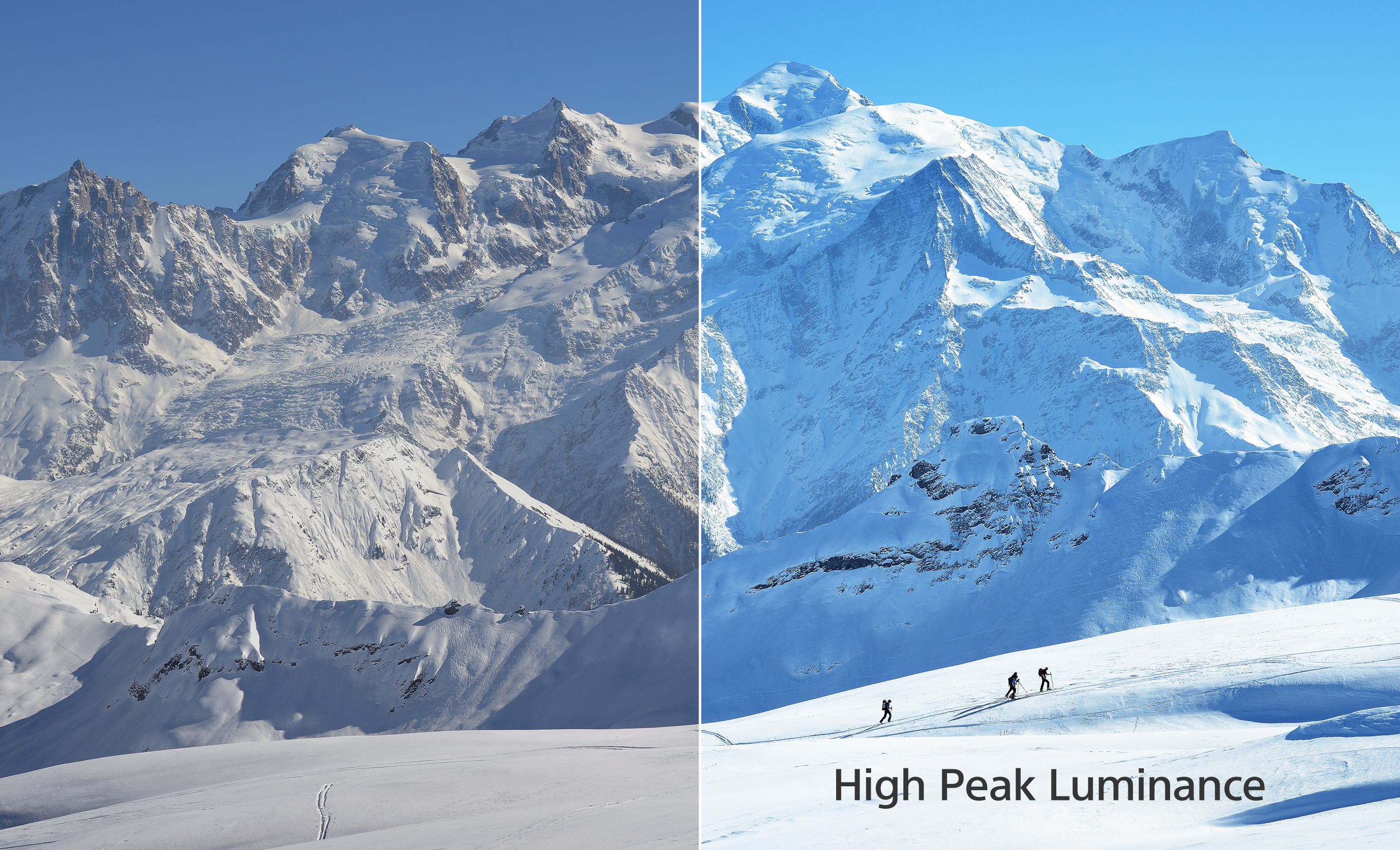 - Høj lysstyrke3: Med højere lysstyrke end nogensinde før kan de nye tv gengive naturtro scener med absolutte detaljer, selv i det skarpeste dagslys. F.eks. vil et strålende, solbeskinnet og snedækket bjerglandskab fremstå endnu mere realistisk end nogensinde før.